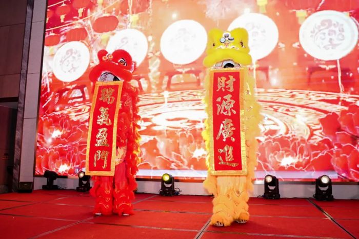 年会在激昂的鼓声中拉开帷幕。鼓手们挥舞鼓槌,密集的鼓点如暴风骤雨倾泻而下,磅礴气势瞬间抓住众人目光,点燃现场热烈氛围。紧接着,欢腾舞狮隆重登场,瑞狮灵动活泼,时而昂首摆尾,时而上下翻腾,将祥瑞与欢乐传递给现场每一位朋友。